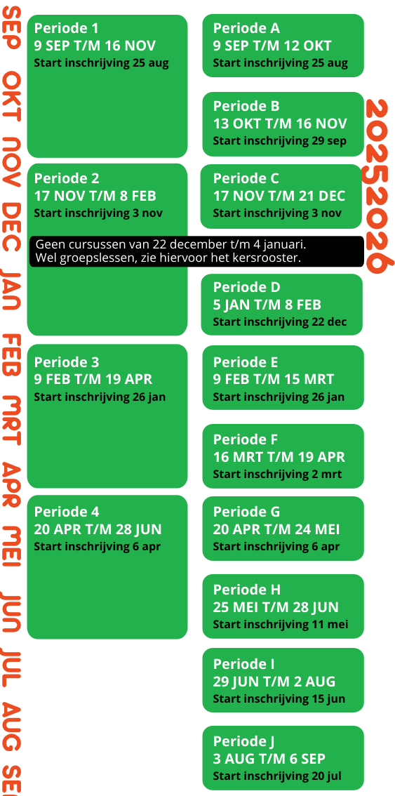 De cursussen van Olympos worden door het jaar heen in verschillende periodes aangeboden. De meeste cursusperiodes duren tien weken/lessen (periode 1 t/m 5), maar er zijn ook kortere cursusperiodes van o.a. vijf weken/lessen. De tennistrainingen duren zestien weken.